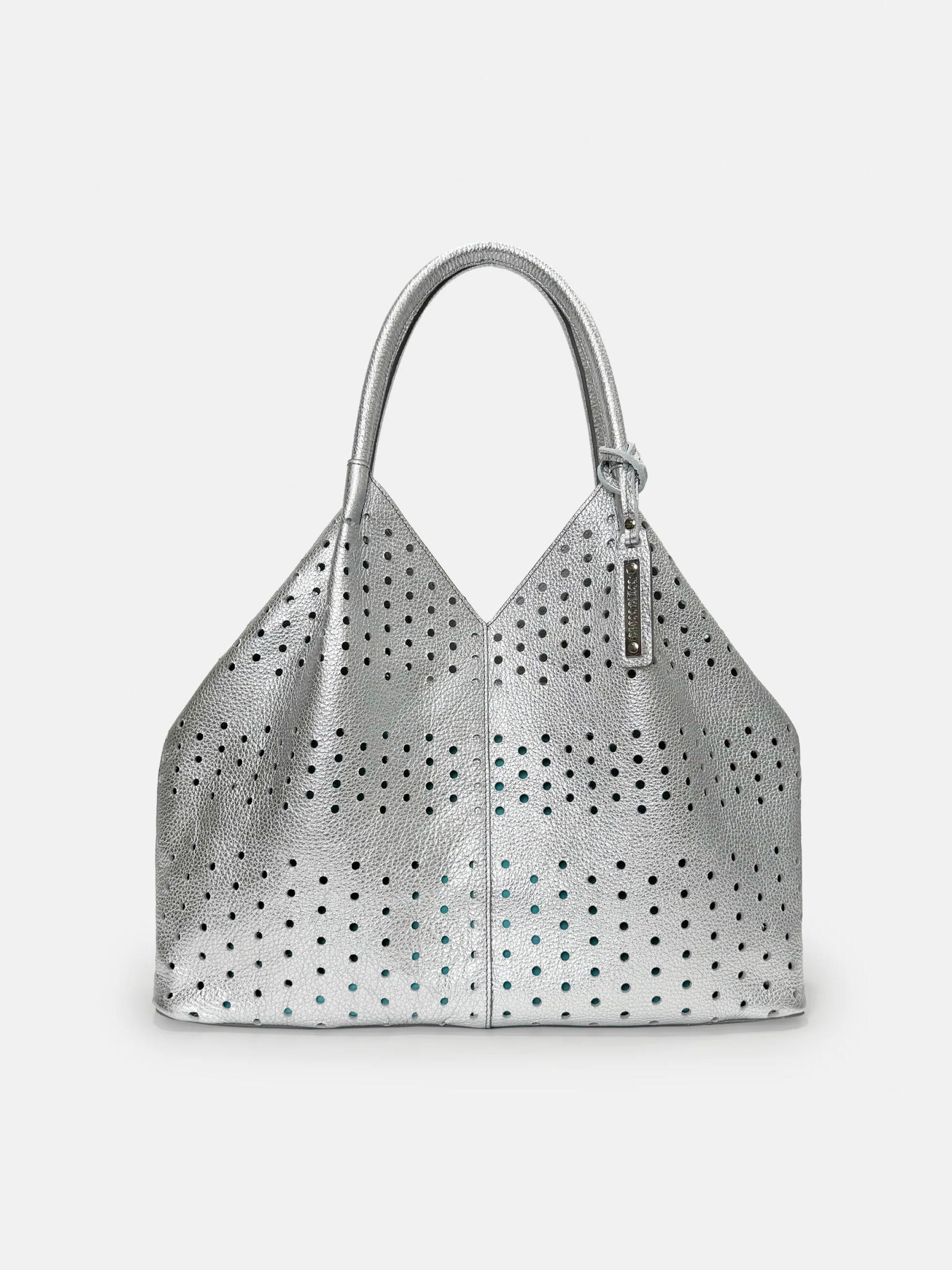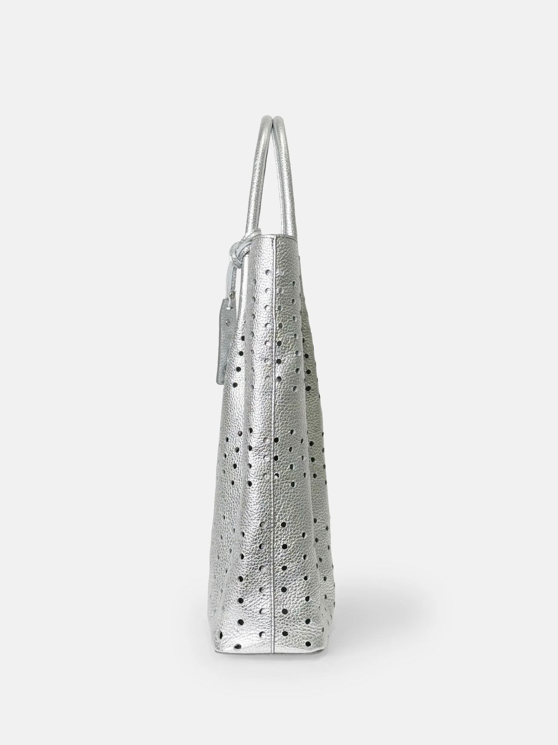 イタリア製の一枚革に、ボーダー調の水玉カットワーク加工を施したメタリックレザーのトートバッグ。