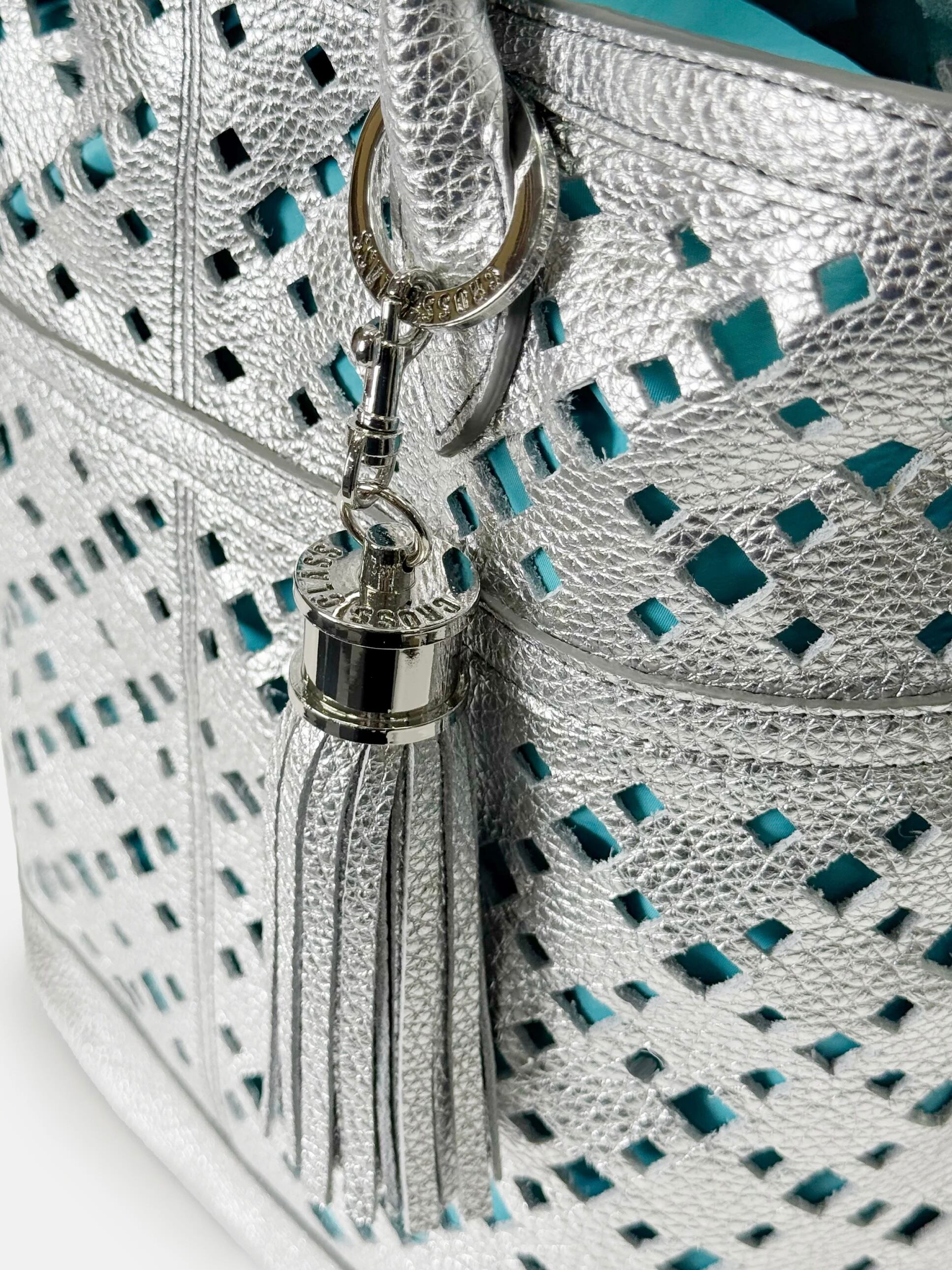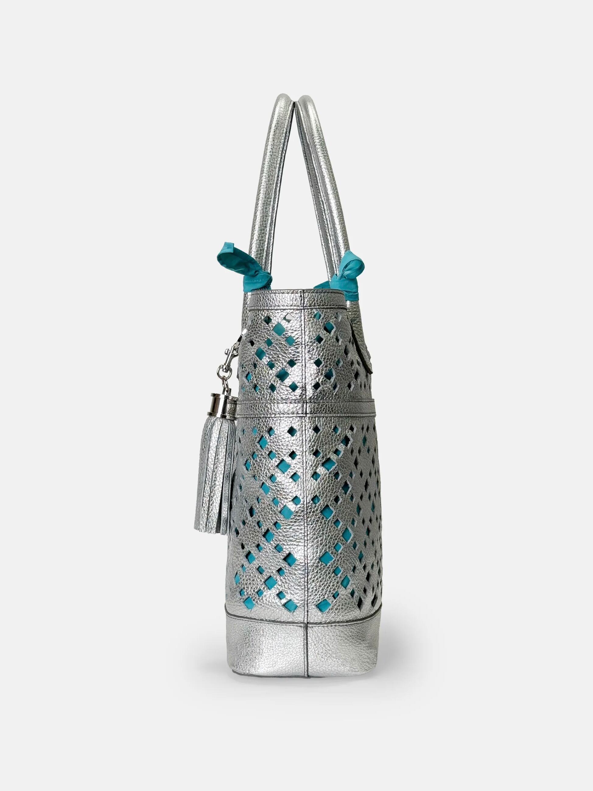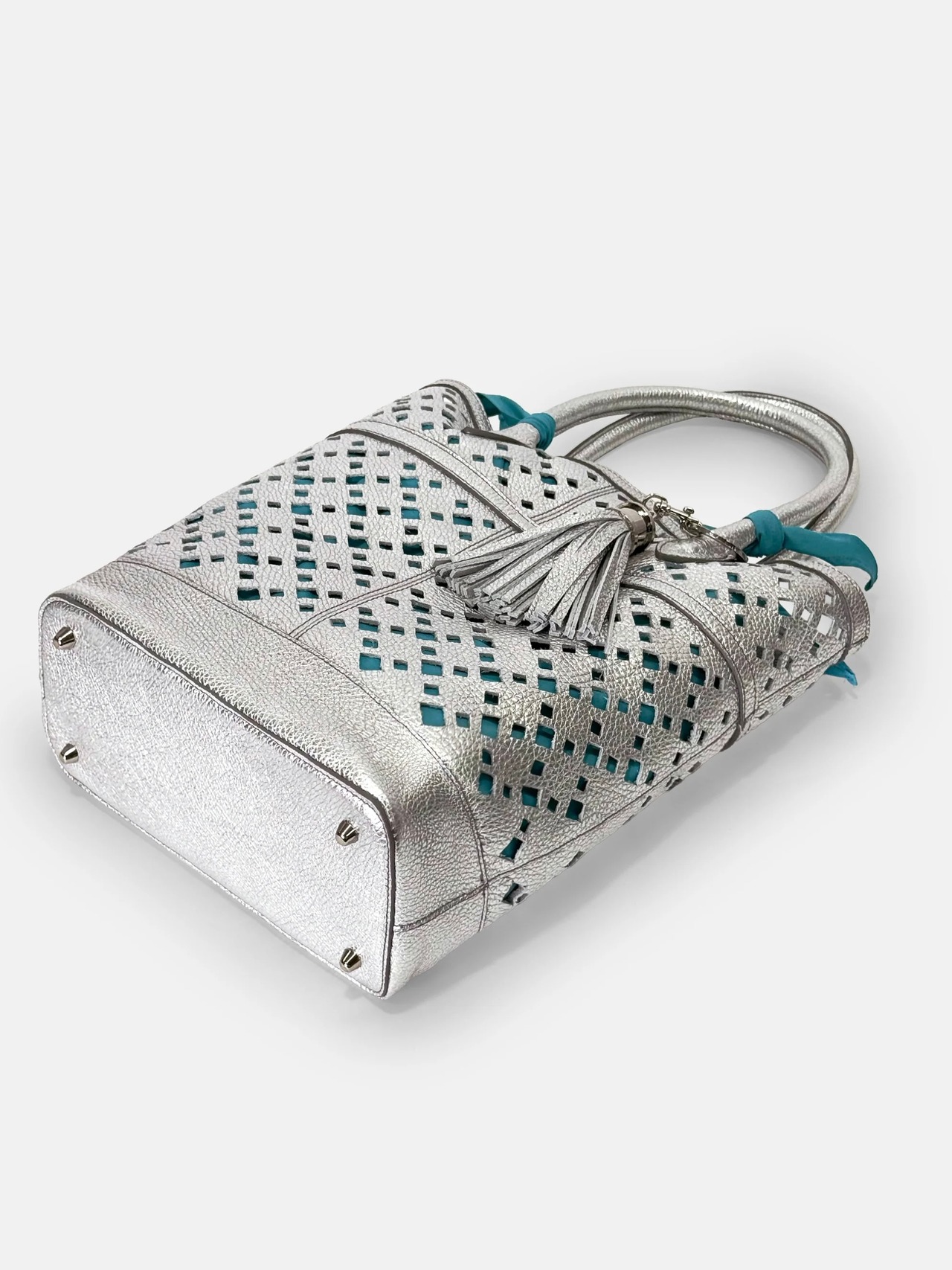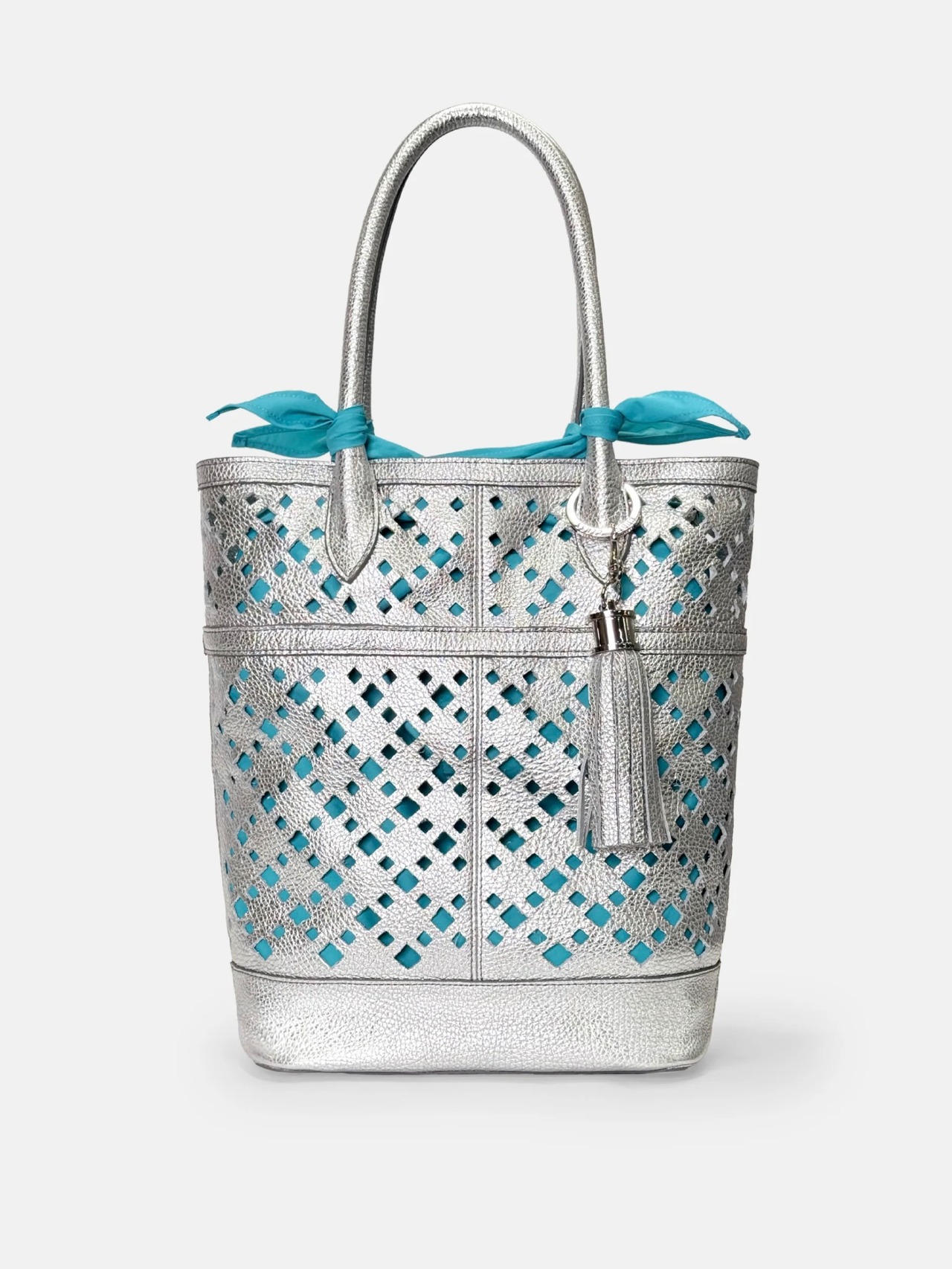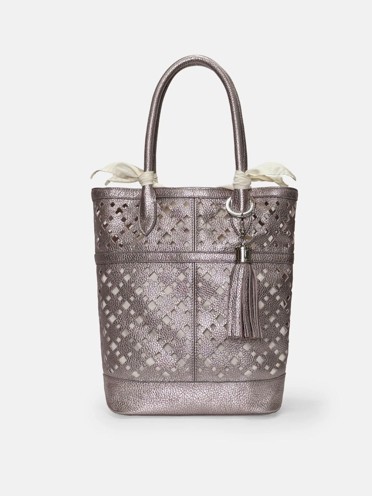 イタリア製の軽量で柔らかなメタリックレザーに、ダイヤ柄の幾何学模様をカットワーク加工したトートバッグ。