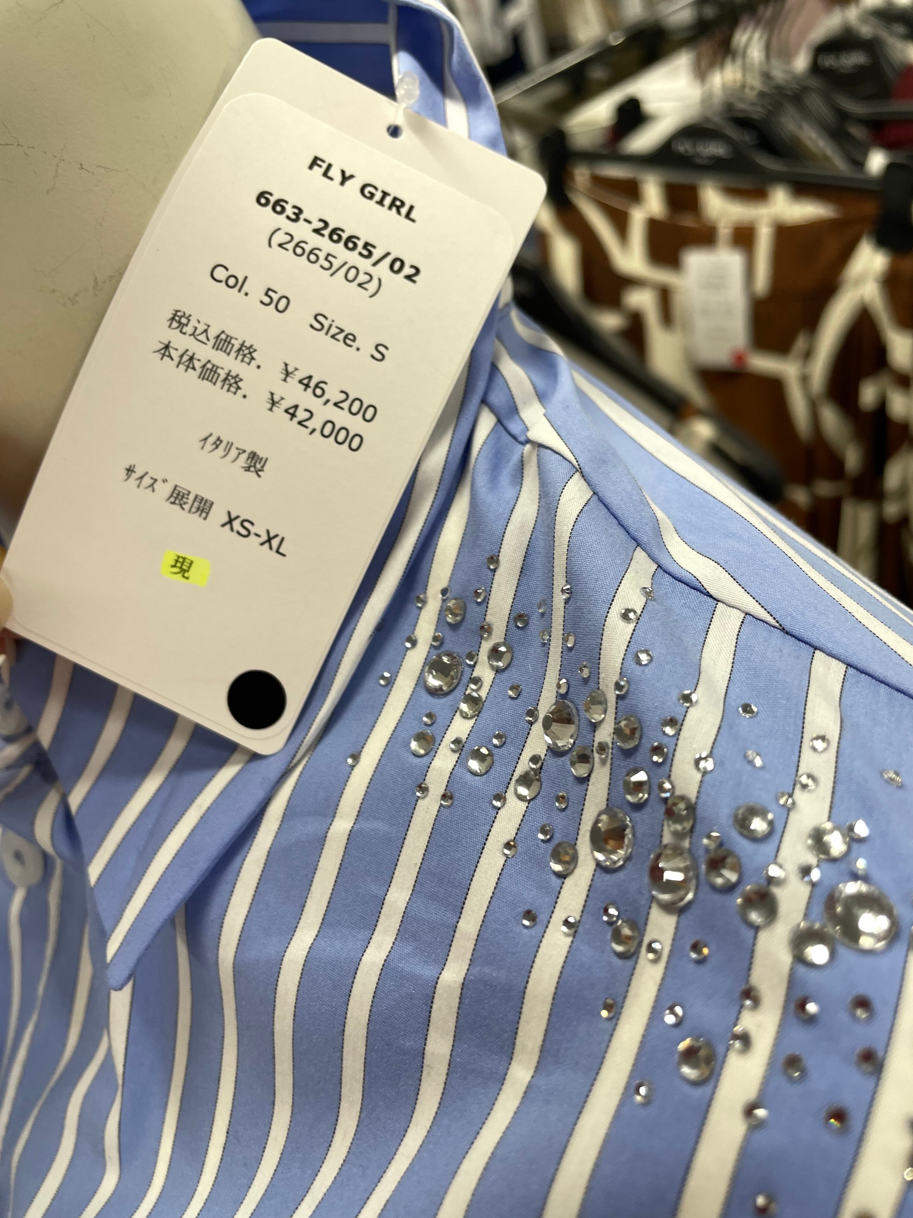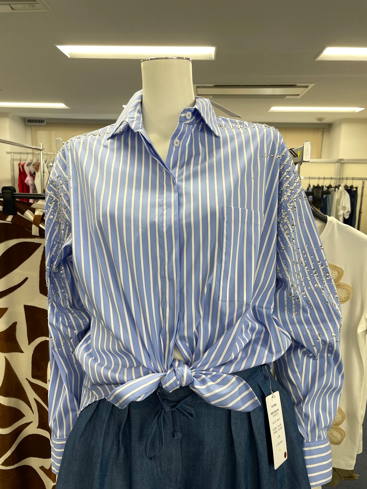 爽やかなストライプ柄が魅力の「キラキラスリーブストライプシャツ」は、袖に施されたキラキラのディテールが一層の華やかさを加えます。