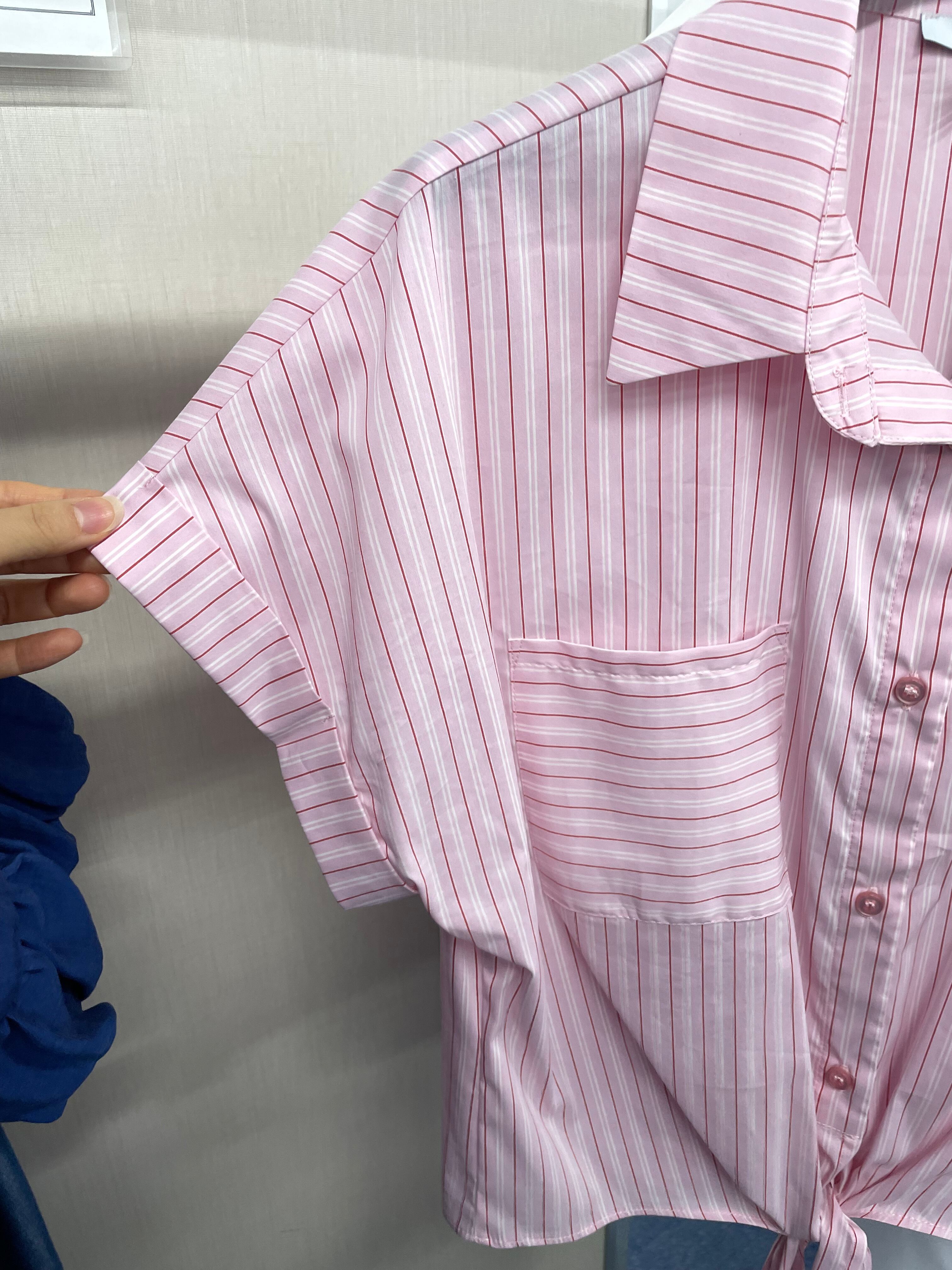 サラッとした素材感とショート丈が魅力の「ショートスリーブストライプシャツ」は、爽やかな印象を与える一枚です。