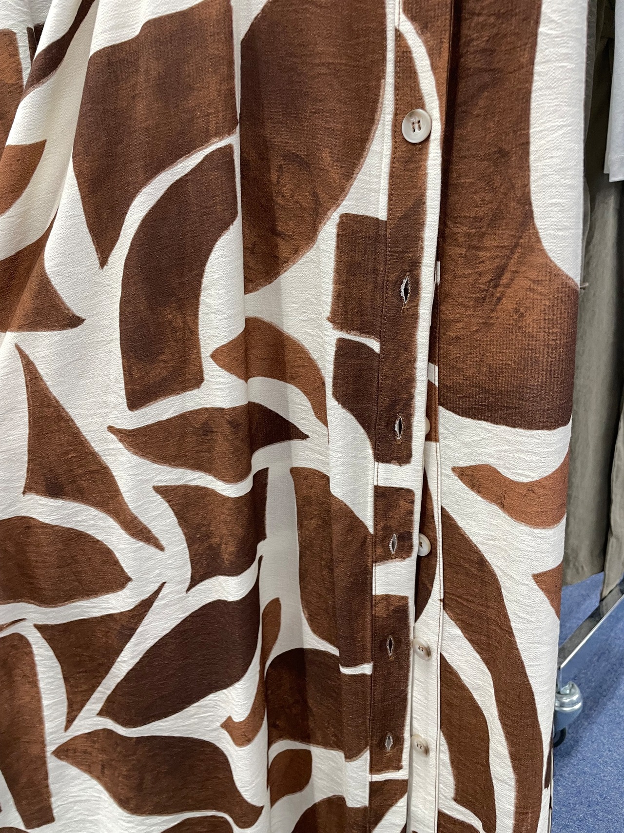 落ち感のあるブラウンとオフホワイトの幾何学プリントが魅力な「幾何学プリント前開きワンピース」。