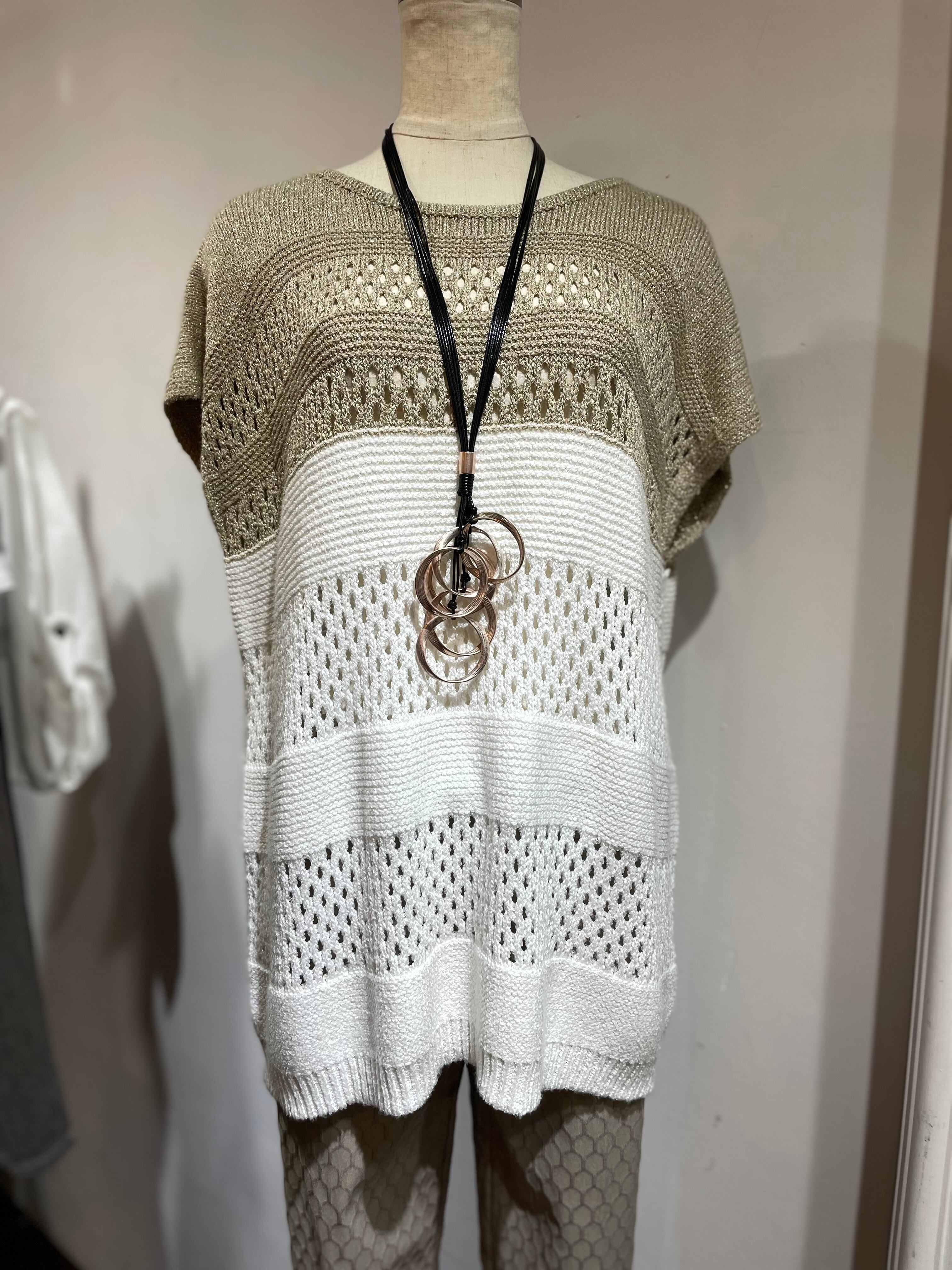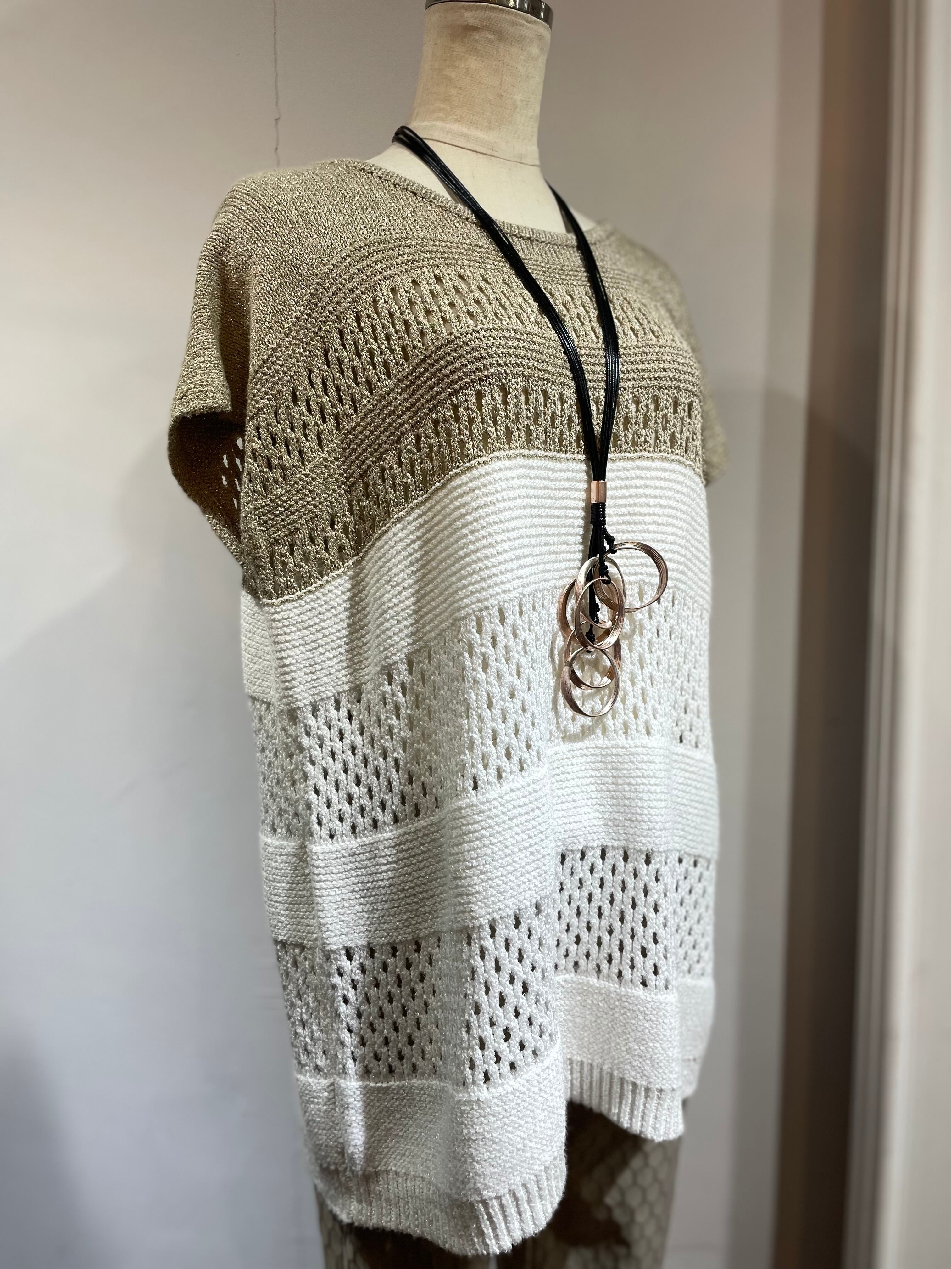 ラメ混の柔らかなニット素材が特徴の「配色ニットトップス」は、上品な配色が魅力で、ニットの編み方もおしゃれです。普段使いから特別なシーンまで幅広くご活用いただけます。着心地良く、どんなボトムスとも相性抜群です!