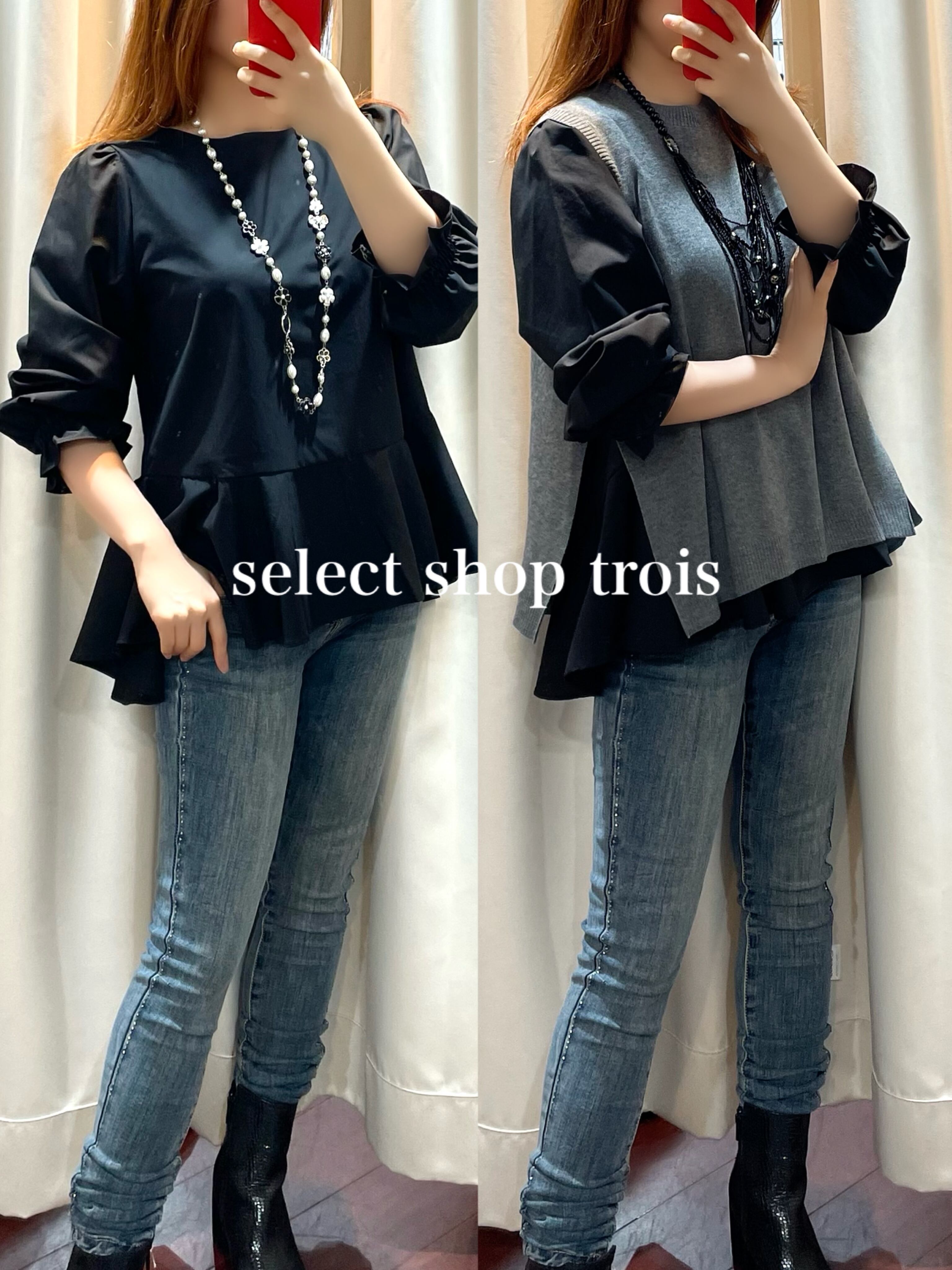 洗練されたデザインの「ブラウスベストアンサンブル」は、ペプラムブラウスとデザインニットベストが別々になったお得なアイテムです! それぞれ単独でもコーディネートが可能で、シーンに合わせたスタイリングが楽しめます。