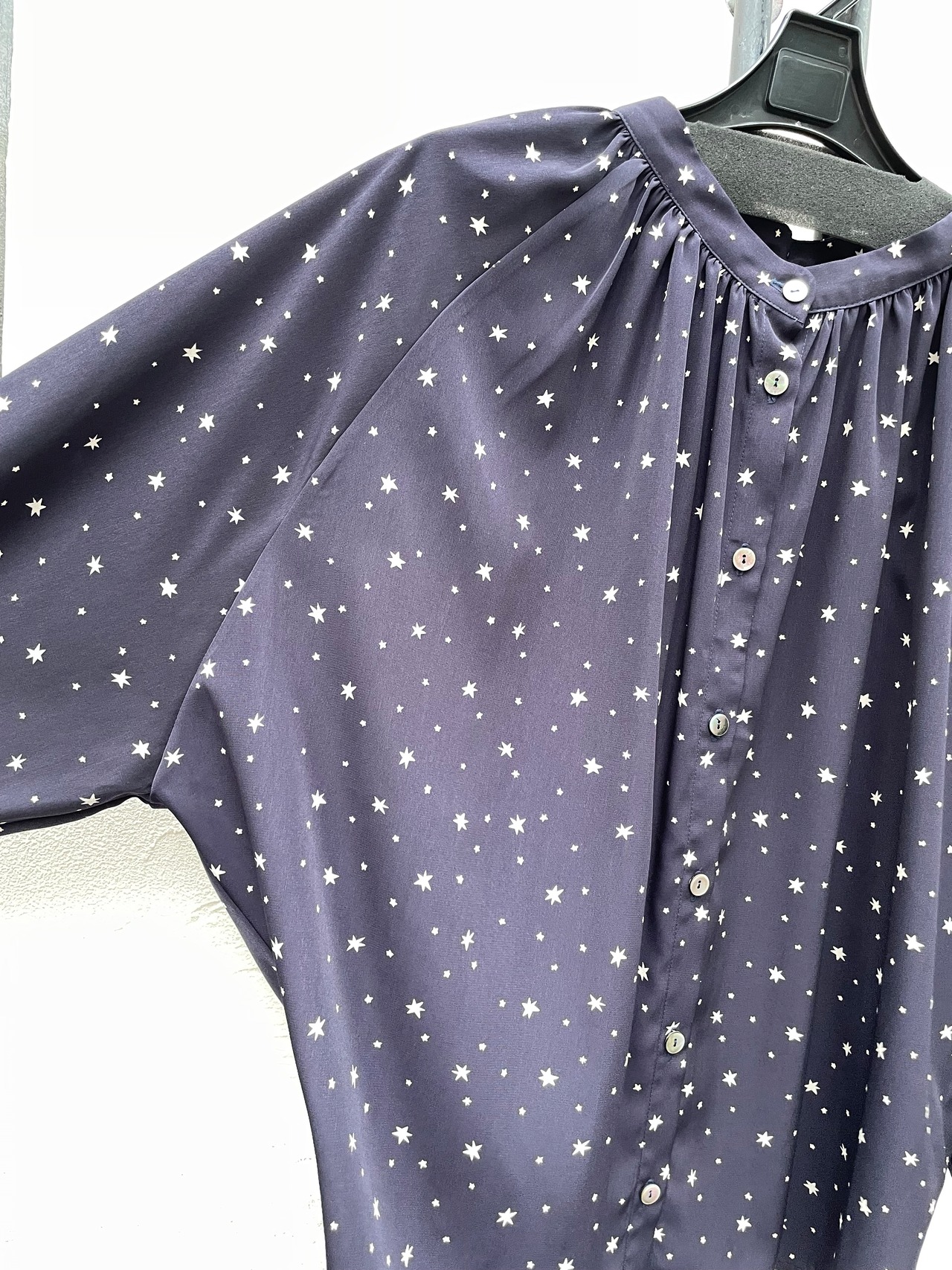 リラックスとエレガントさを兼ね備える「スターネイビードルマンブラウス」は、フロントボタンがアクセントの洗練された一枚です! ラグラン袖のデザインで動きやすく、日常のコーディネートにもぴったりのアイテムです。
