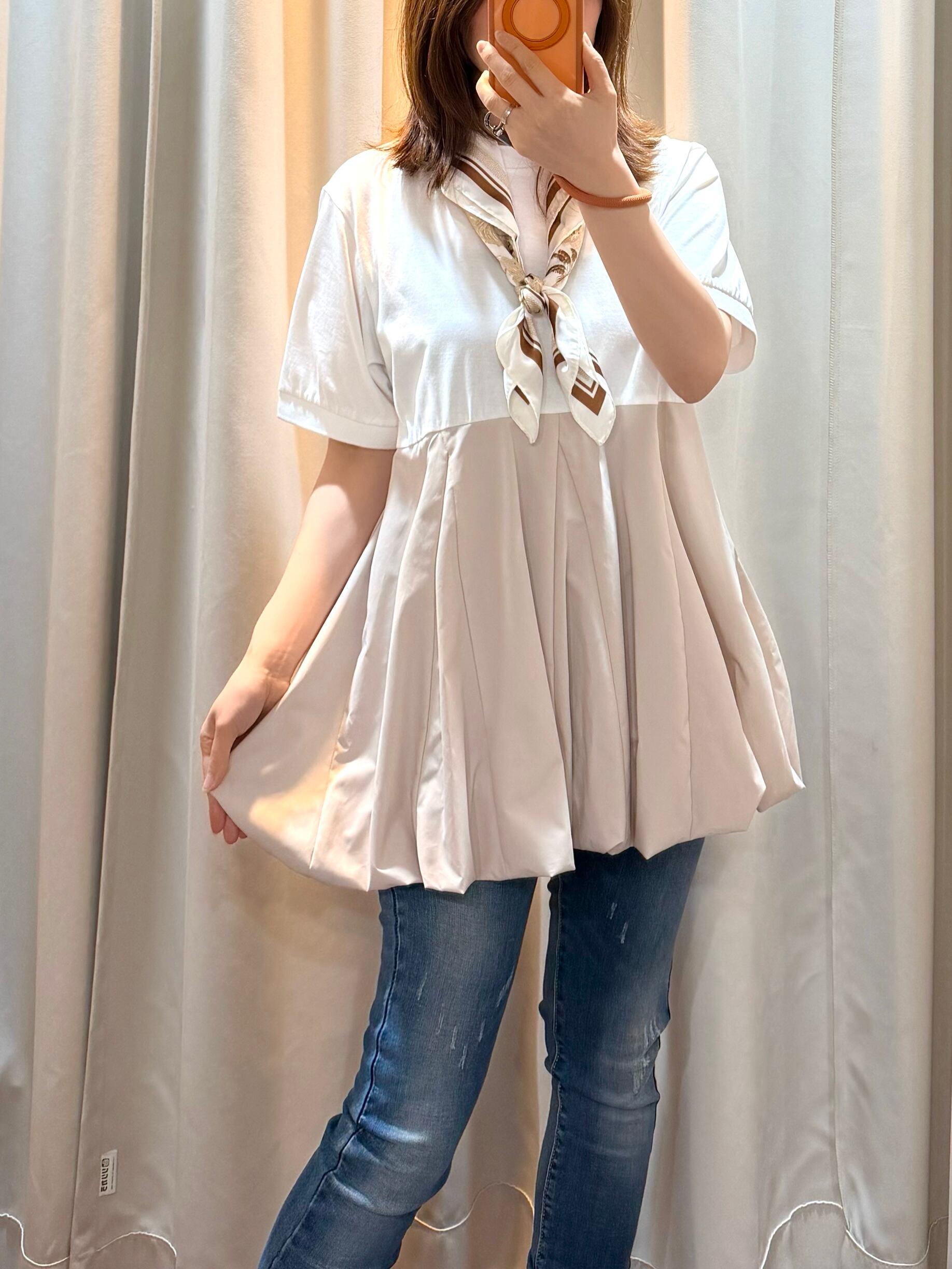 着心地の良い素材を使用したこちらのチュニックは、裾がバルーンになっており、シルエットに独特のアクセントを与えます。柔らかな生地感が心地よく、デイリーコーディネートはもちろん、リラックスしたい日にも最適です。カジュアルながらもスタイリッシュな印象を演出し、多様なスタイリングに活躍するアイテムです。